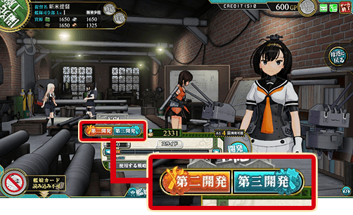 『開発工廠』では、戦略ポイントを使用して装備開発を行う『第二開発』と、『戦略ポイント』と『勲章』を使用して艦娘ごとに特定の装備を開発する『第三開発』が選択できます。